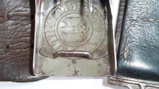Die struck steel belt buckle marked Dr.F. & Co for the maker Dr .Franke & Co Ludensheid and dated 1941 complete with its unaltered leather belt still very supple,size stamped 90 M234