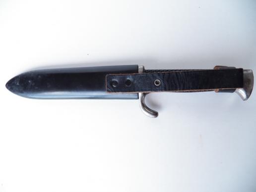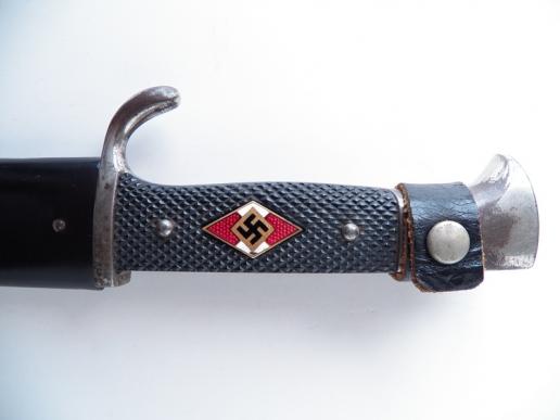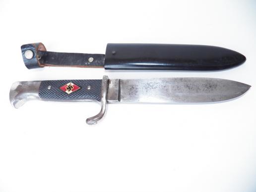 Nice Transitional HJ dating from 1935 -36 with motto by the maker Carl Eickhorn ,good movement to the HJ diamond and undamaged grip plates and full length blade , scabbard in very good condition with no damage and most of its original black paint ,undamaged leather hanger and press stud M565205