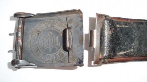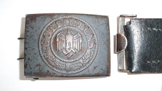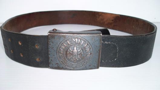 Steel die struck Army belt buckle in the later blue grey finnish complete with the later model RB numbered belt leather with the simple punched holes construction replacing the internal leather tongue , 39 inches in length both in good used condition L730