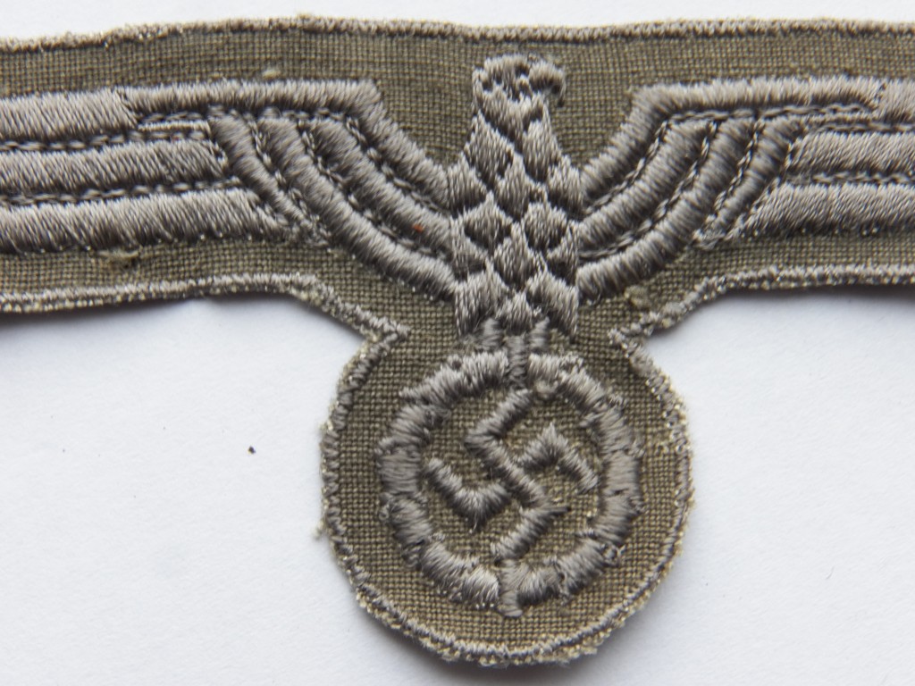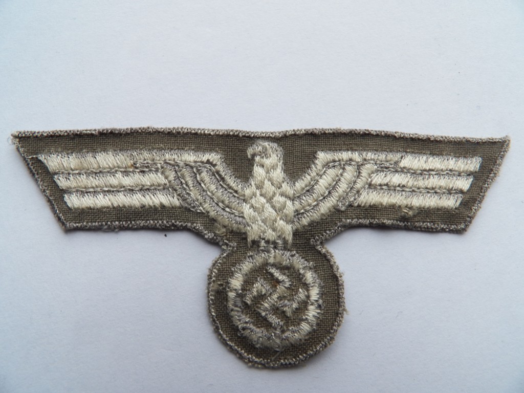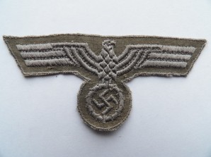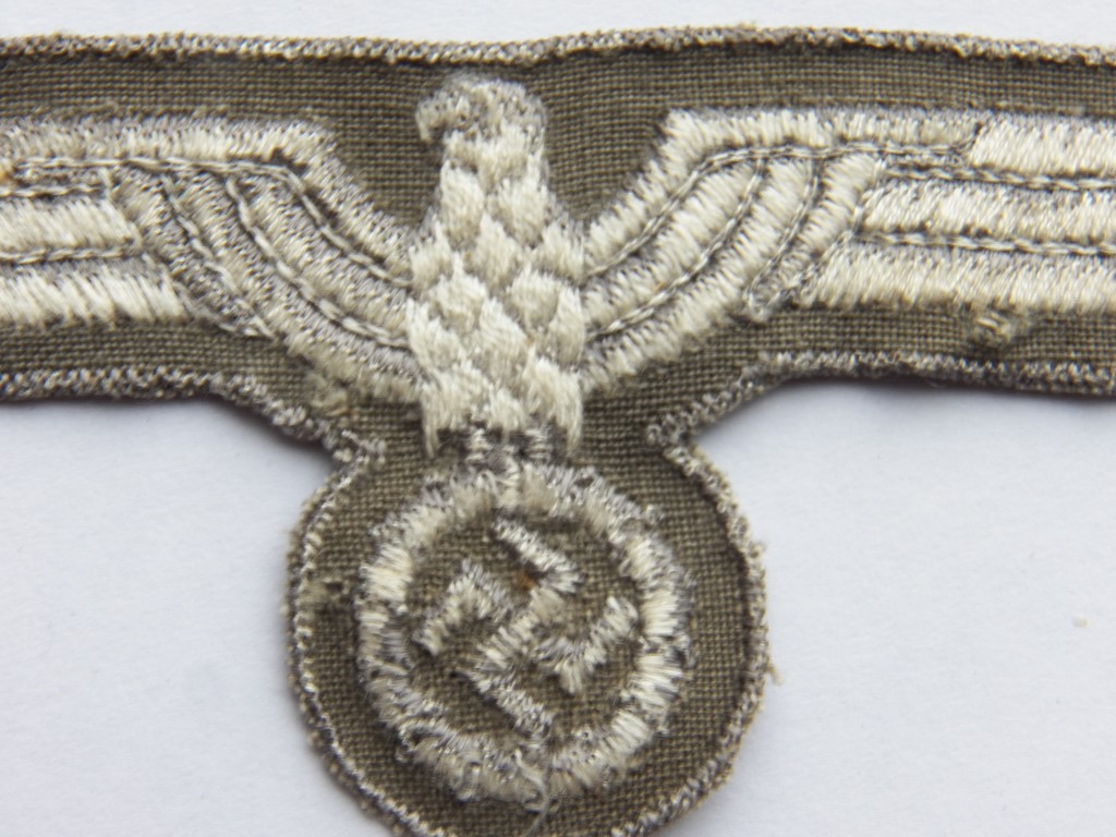 Later war produced enlisted ranks breast eagle ,machine woven grey thread eagle on grey cotton backing also observed worn on the army shirt,excellent unissued grade one condition
