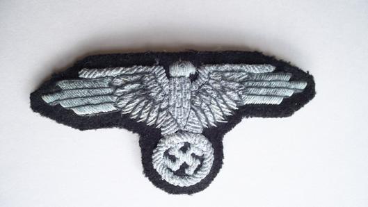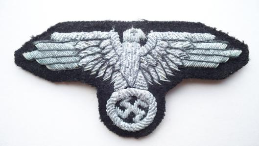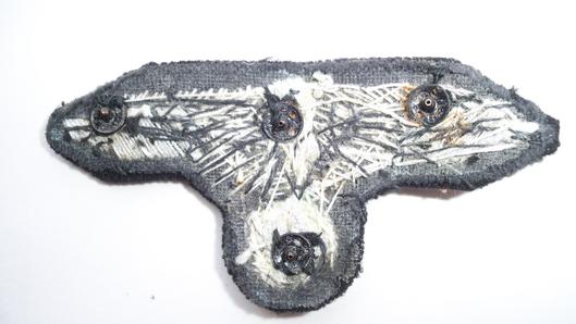 SS hand embroidered bullion cap eagle on black backing cloth , the reverse has the male snaps where it was at one time attached to an SS officers cap, oxidised but still an excellent example L379