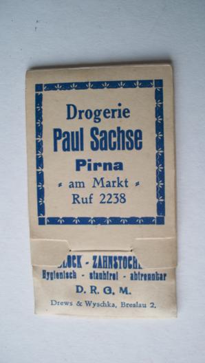 Very nice packet of tooth picks from the Chemist shop Paul Sachse, DRGM marked packet