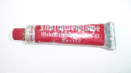 Unused metal tube containing fussalbe ,tubes marked Wehrkreissanitatspack 111 Berlin,unused with contents intact essential item for the Fussfantrist L592