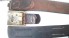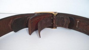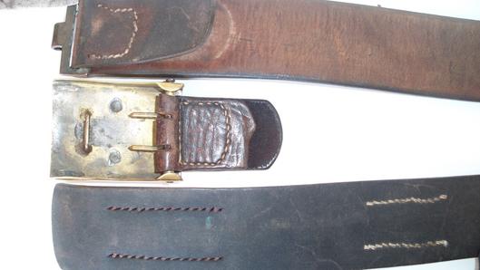 Brass buckle with nickel centre leather tab feint makers stamp complete with its belt leather heavy quality leather in good condition with feint markings period moved tongue adjustment ,overall length 36 inches L96385